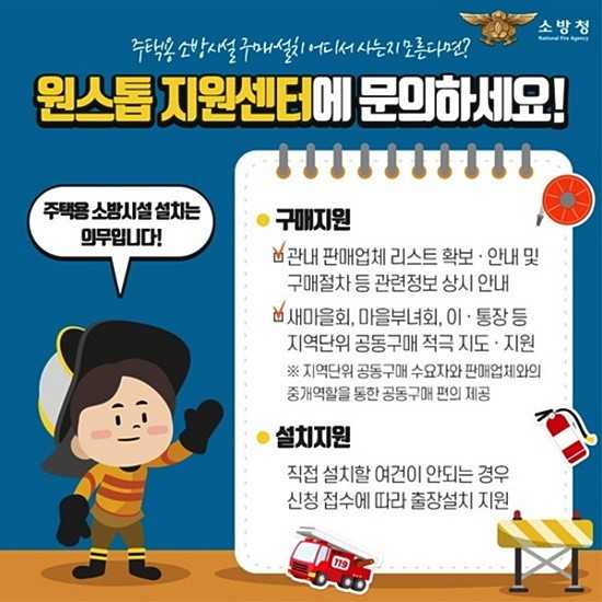 ‘원스톱 지원센터’는 소화기와 단독경보형 감지기 등 주택용 소방시설의 구입 방법부터 설치 요령까지 다양한 정보를 한곳에서 안내하는 서비스로, 초기 화재 대응력 향상을 위해 마련됐다.