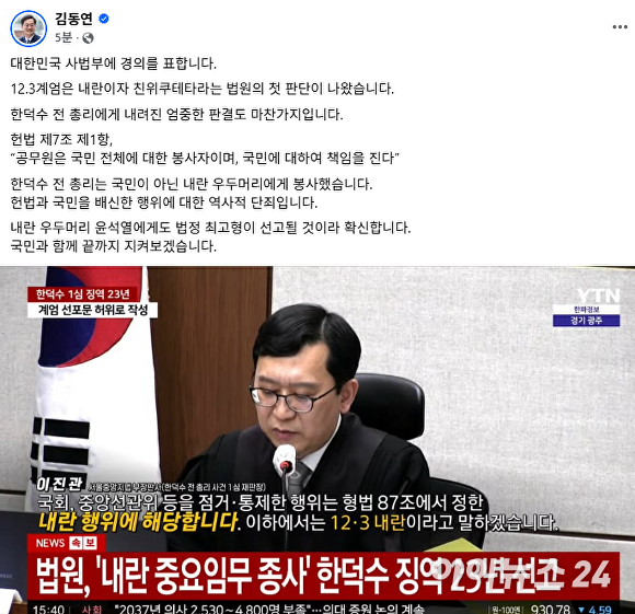 이에 김 지사는 "헌법 제7조 제1항 공무원은 국민 전체에 대한 봉사자이며, 국민에 대해 책임을 진다고 규정하고 있다"면서 "한 전 총리는 국민이 아닌 내란 우두머리에게 봉사한 만큼 이번 판결은 헌법과 국민을 배신한 행위에 대한 역사적 단죄"라고 말했다.