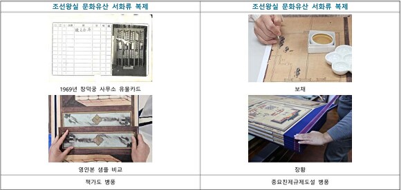 책가도와 종묘친제규제도설 병풍은 고문헌과 유물 관리대장을 바탕으로 조선 왕실 장황 기법을 재현했다. 보소당인존은 포갑끈 복원에 장서각 자료를 활용, 당의는 안감의 꽃무늬까지 정교히 재현해 원형에 충실했다. 이 과정에서 원 유물의 디지털 데이터도 확보, 향후 교육·전시 콘텐츠로 활용될 예정이다.