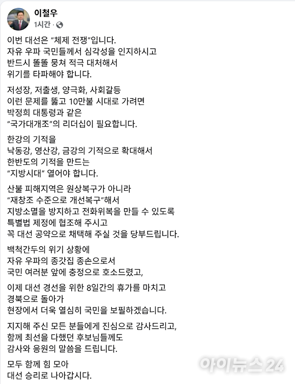[아이뉴스24 이진우 기자] 이철우 경북도지사가 제21대 대통령 선거 국민의힘 경선 참여를 마치고 경북으로 복귀하며 "이번 대선은 단순한 정권 교체가 아닌 체제 전쟁"이라며 자유 우파 진영의 단결을 호소했다.