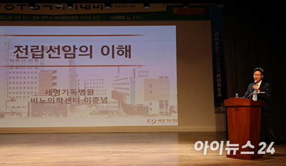 [아이뉴스24 이진우 기자] 포항세명기독병원(병원장 한동선) 비뇨의학센터 이준녕 센터장은 지난 22일 경주서라벌문화회관에서 열린 경주시 주최 '경주행복아카데미'에서 '전립선암의 이해'를 주제로 시민 대상 건강강연을 진행했다.